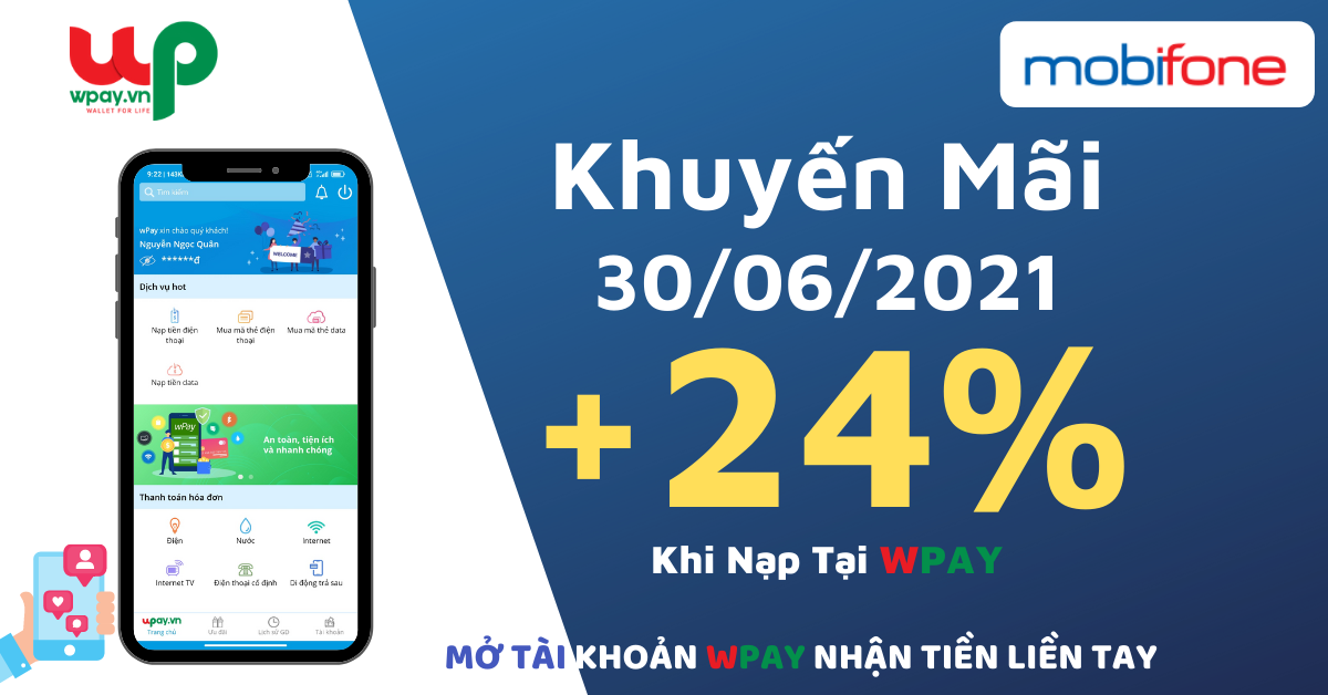 - ƯU ĐÃI KHỦNG dành cho khách hàng mua thẻ điện thoại Mobifone tại wPay nhận ngay 24% giá trị thẻ nạp.