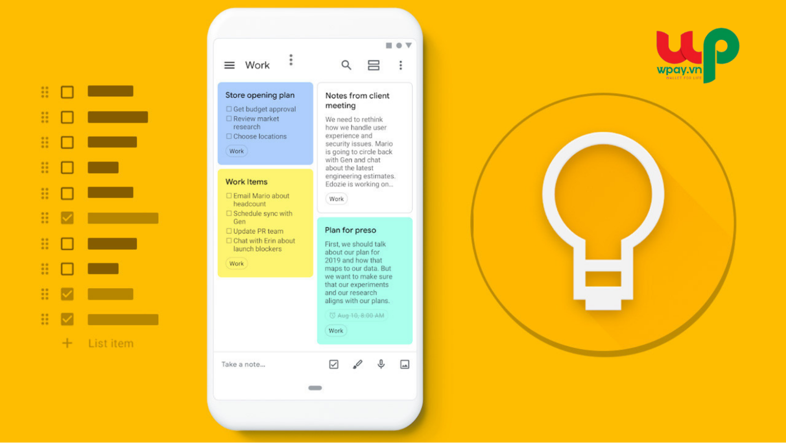 Cũng giống như Evernote, Google Keep là ứng dụng tạo các ghi chú tối ưu, hiệu quả. Người dùng có thể viết ghi chú mới, tạo danh sách công việc, thu âm… dễ dàng, nhanh chóng. Keep cho phép người dùng thêm màu sắc hoặc gắn nhãn vào ghi chú để dễ tìm kiếm. Ngoài ra, người dùng còn có thể chia sẻ ghi chú của mình cho đồng nghiệp và người thân.